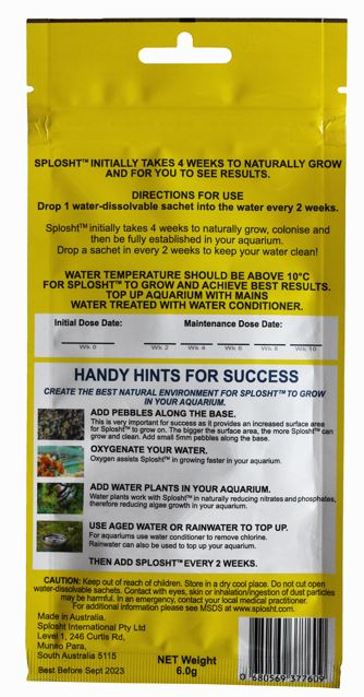 Using Splosht couldn’t be easier. Simply drop a water-dis-solvable sachet into your pond or aquarium every two weeks. Each Splosht Pack lasts for three months, ensuring continuous cleaning and a fresh water environment.